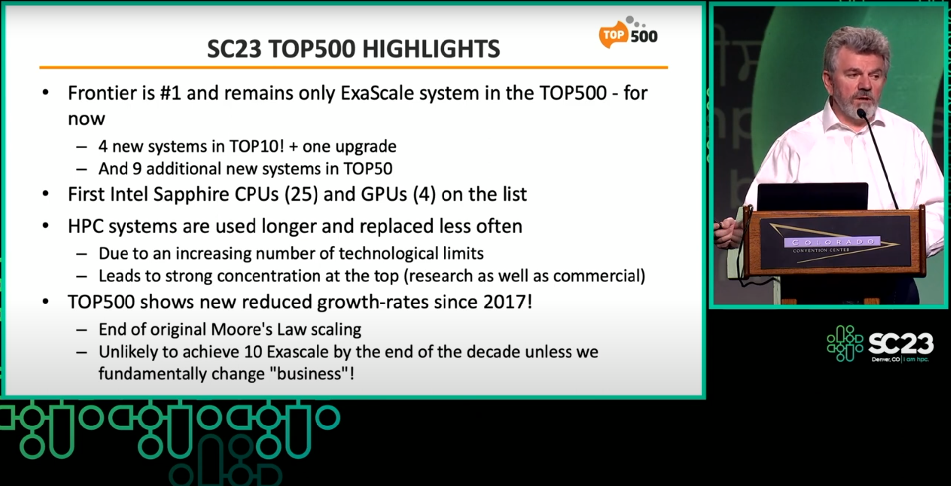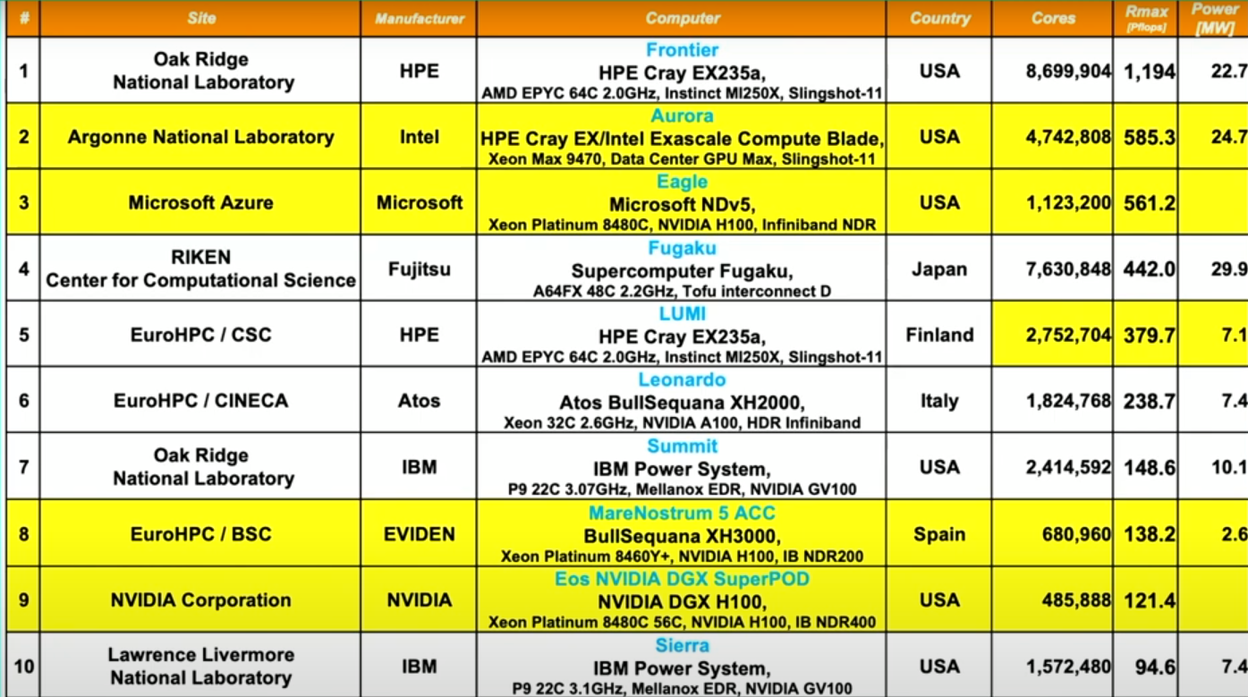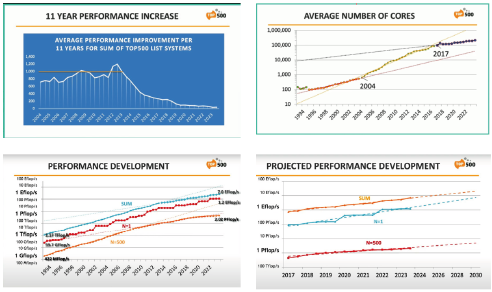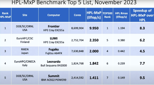 list, at BoF (Birds of Feather) session. The Frontier system at the Oak Ridge National Laboratory, Tennessee, USA remains the No. 1 system on the TOP500 and is still the only system reported with an HPL (High-Performance LINPACK) performance exceeding one Exaflop/s. No. 2, The Aurora system at the Argonne Leadership Computing Facility, Illinois, USA is currently being commissioned and will at full scale exceed Frontier with a peak performance of 2 Exaflop/s. It was submitted with a measurement on half of the final system achieving 585 Petaflop/s. Newly listed as No. 3 The Eagle system installed in the Microsoft Azure cloud in the USA achieved an HPL score of 561 Petaflop/s. The fastest European supercomputer the LUMI system at EuroHPC/ CSC in Finland has been further upgraded and is now listed as No. 5 with HPL score 380 Petaflop/s. Dr. Strohmaier presented also a list of the systems based on the HPL-MxP (formally HPL-AI) benchmark, which measures performance for mixed-precision calculation. No. 1 Frontier demonstrated 9.95 Exaflop/s. Historical data on performance increases and core-counts illustrated the progression of the processor performance plateau. In the end of the session, Dr. Strohmaier said that it is “unlikely to achieve 10 Exascale by the end of the decade unless we fundamentally change ‘business’”. It confirms that new technology, like the world’s first universal processor Prodigy, is essential for the development of further progress. We are looking forward to SC24 which will take place in Atlanta at the Georgia World Conference Center. The SC24 conference theme is “HPC Creates” and will focus on the enormous generative power that supercomputing affords the modern world. | |
