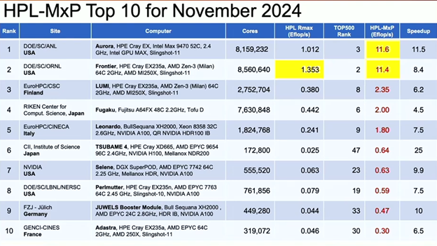 Dr. Strohmaier also presented a list of the systems based on the HPL-MxP (formally HPL- AI) benchmark, which measures performance for mixed-precision calculation. No. 1 Aurora demonstrated 11.6 Exaflop/s.