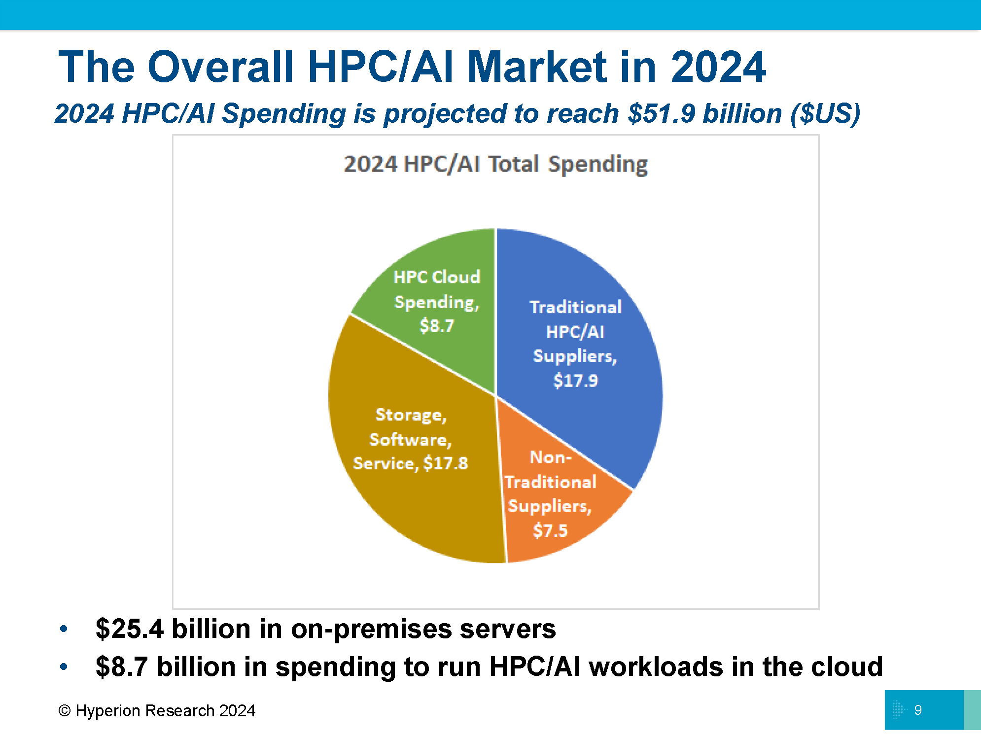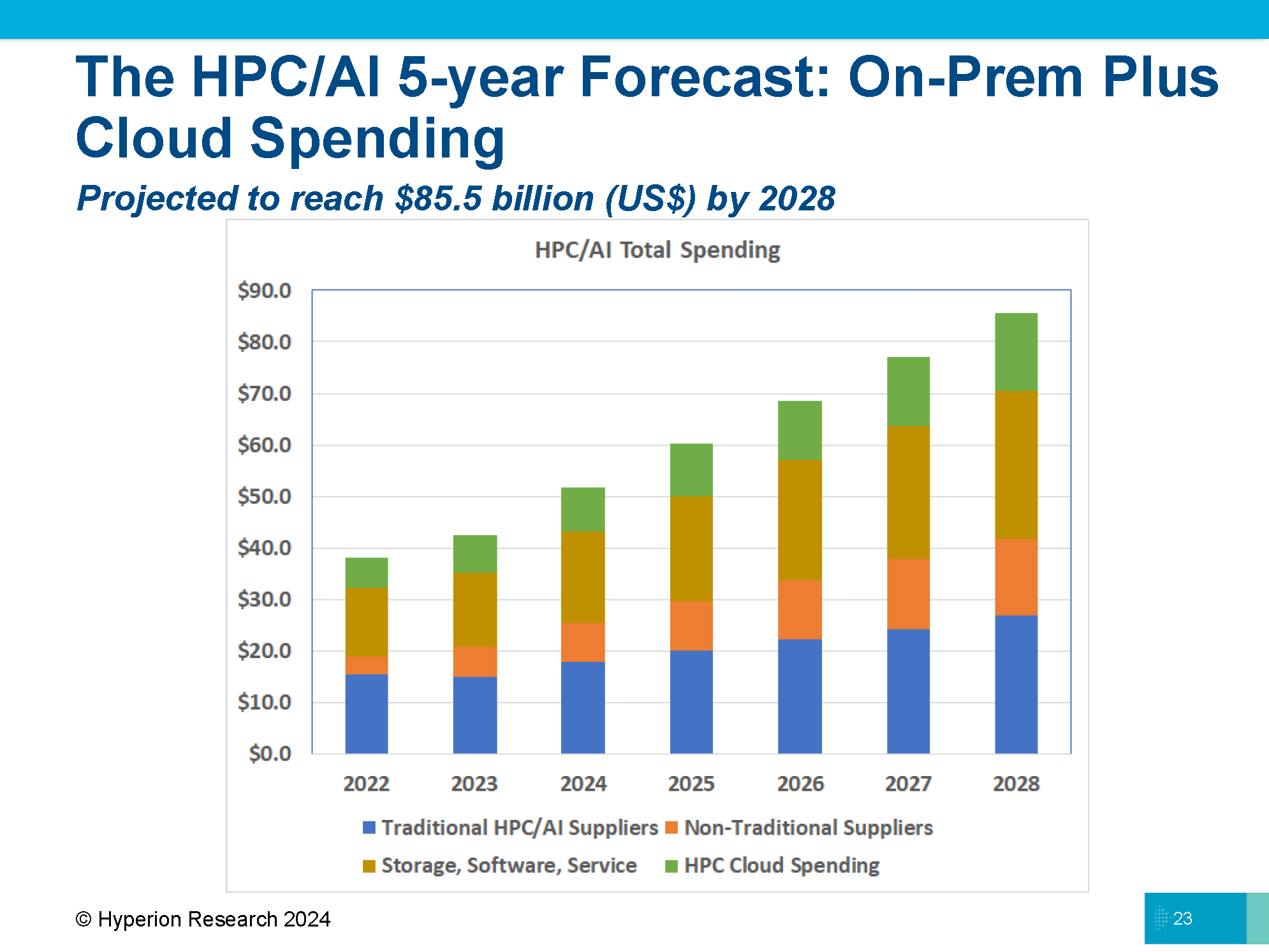 2024 HPC/AI spending was projected to reach $51.9 billion. The HPC/AI 5-year forecast predicts reaching $85.5 billion by 2028.
