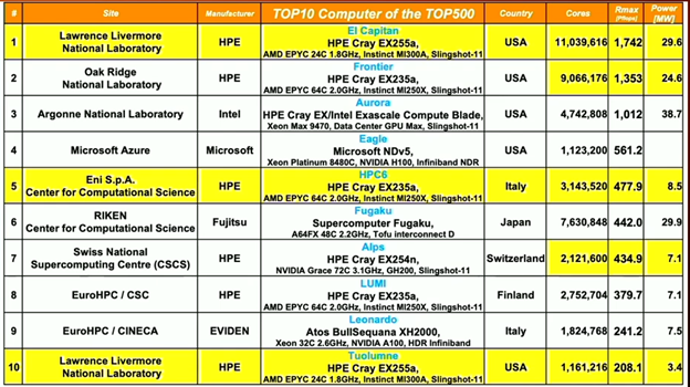 El Capitan at the Lawrence Livermore National Laboratory, California, USA is the new No. 1 system on the TOP500. Frontier at the Oak Ridge National Laboratory (ORNL) in Tennessee, USA is No. 2, and Aurora at the Argonne Leadership Computing Facility, Illinois, USA, is No. 3 system. All three systems have achieved performance exceeding one Exaflop/s.